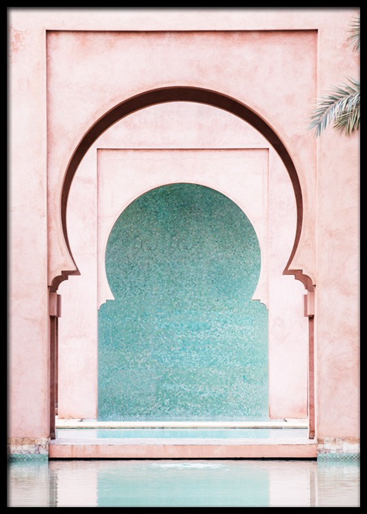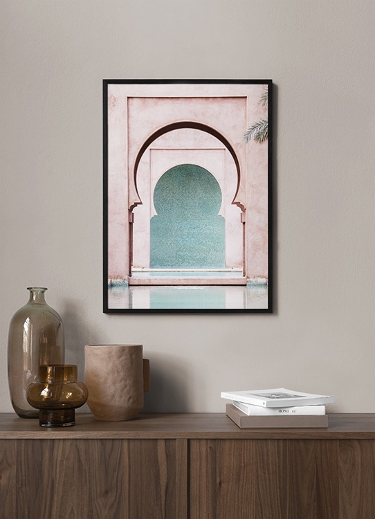 Motivi Handpicked Fotografia di una parete rosa con archi moreschi e una parete blu sullo sfondo. Non smetteremo mai di amare l'architettura in colori pastello! Questo poster con un soggetto di architettura antica realizzata con la massima attenzione ai dettagli esalta veramente la bellezza e il mistero di Marrakech. Questo poster fa parte di Studio Amara, una collezione di fotografie scattate da Desenio Design Studio a Marrakech.