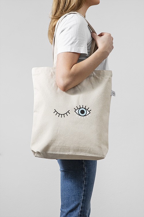 – Borsa in tessuto beige con un occhio blu aperto e un occhio chiuso sul davanti