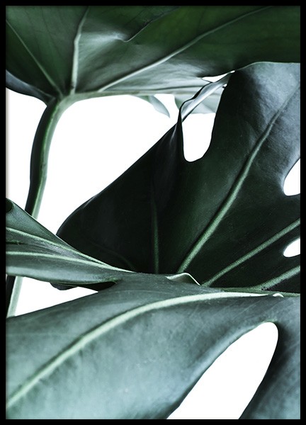 Fotografia ravvicinata della popolare pianta monstera con uno sfondo bianco. Questo si abbinerà magnificamente con poster di foglie verdi simili dalla nostra sortiment.