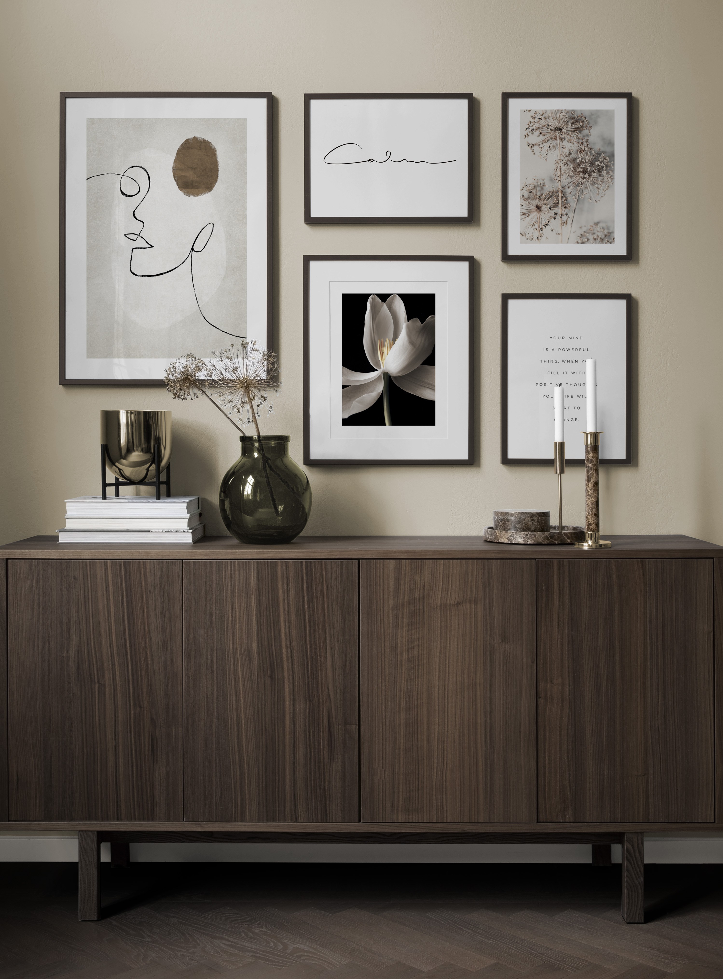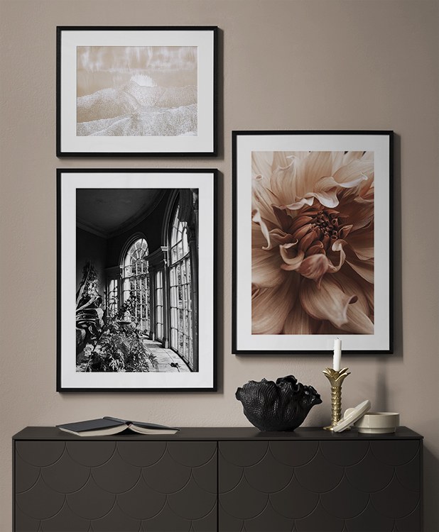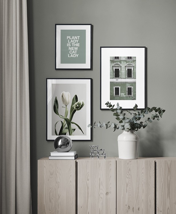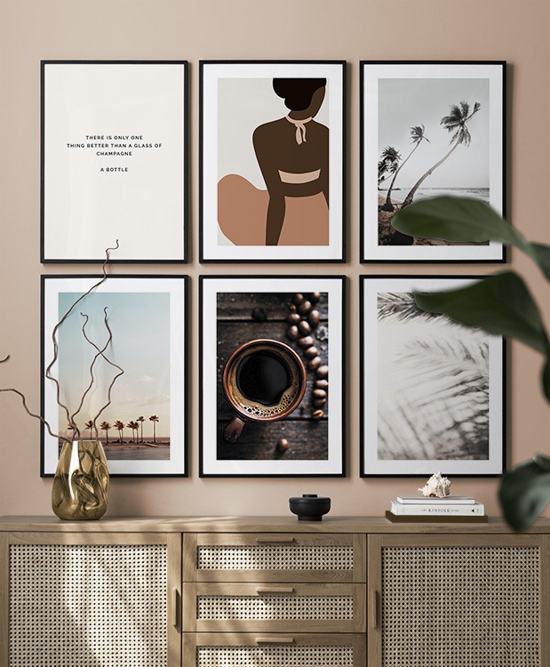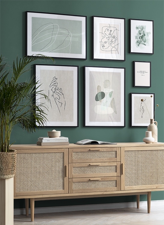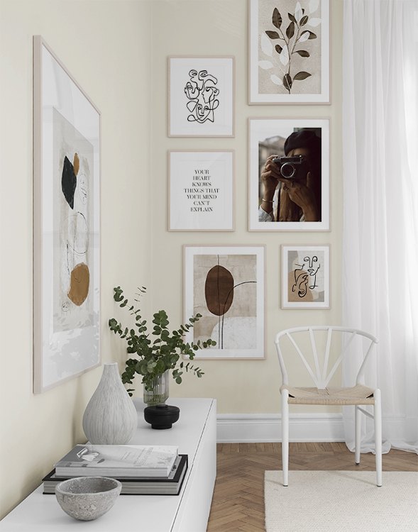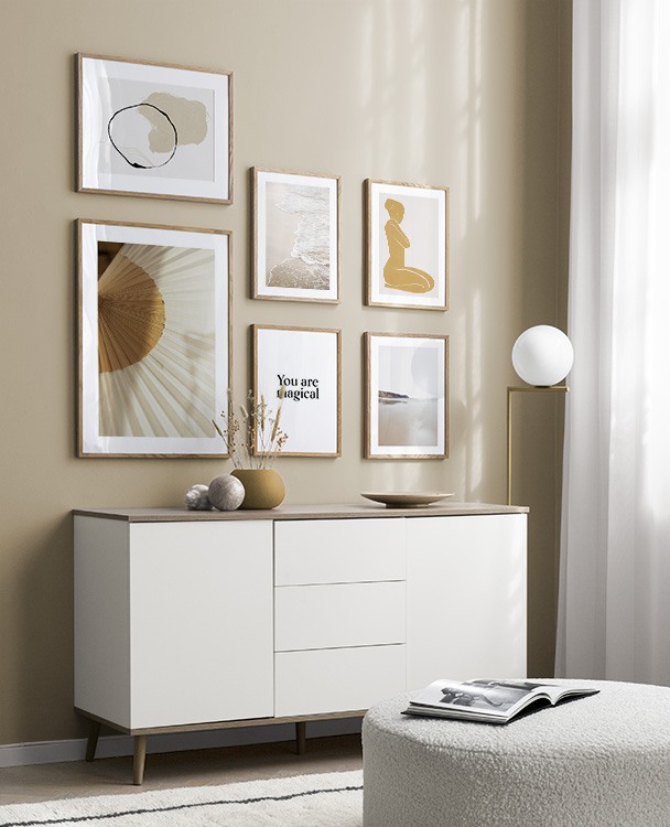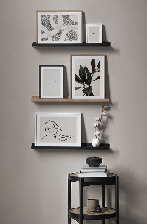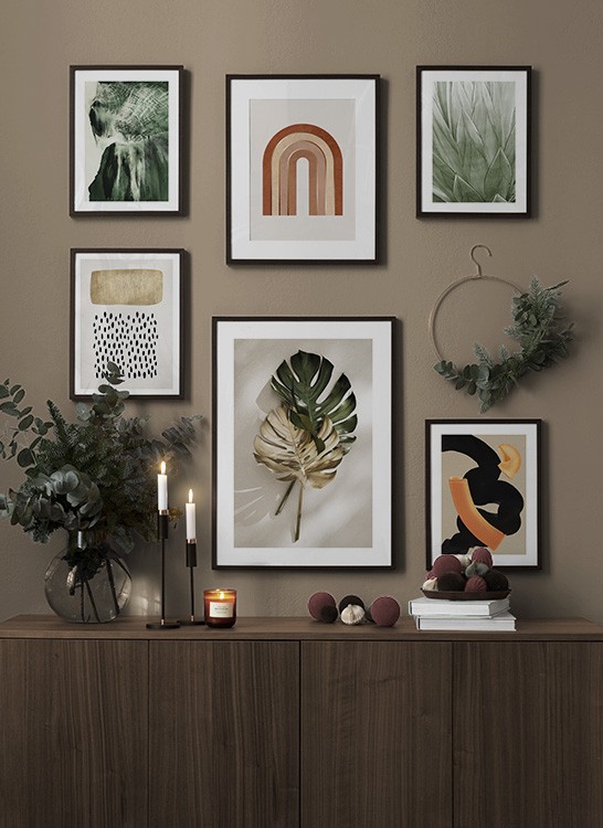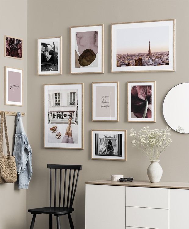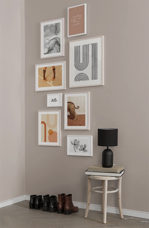 Uno dei nostri consigli più validi è di utilizzare il mobilio per appoggiarvi i poster: non è sempre necessario perforare le pareti! Disponi i poster sullo scrittoio dell’ingresso o sulla panca alla parete, e realizza un’elegante natura morta intorno al poster. In questo modo è facile variare le decorazioni dell’ingresso e adattarle alla stagione e all'umore! Se preferisci appendere i poster, puoi realizzare una moderna galleria indicata per gli ingressi grandi come per quelli piccoli.