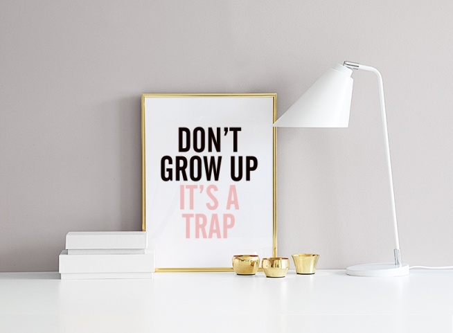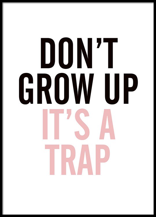 Da 5,57 €Poster con testi e citazioni Poster divertente con il testo Don't grow up, it's a trap in rosa e nero. Un testo a cui tutti noi possiamo relazionarci. Si adatta perfettamente nella stanza dei bambini! Combina più poster in una galleria a parete o collage