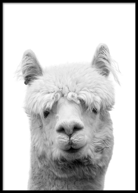Poster in bianco e nero di un lama. Questo design animale si sposa altrettanto bene nel soggiorno o nella stanza dei bambini. Abbinalo ad altre foto artistiche in bianco e nero.