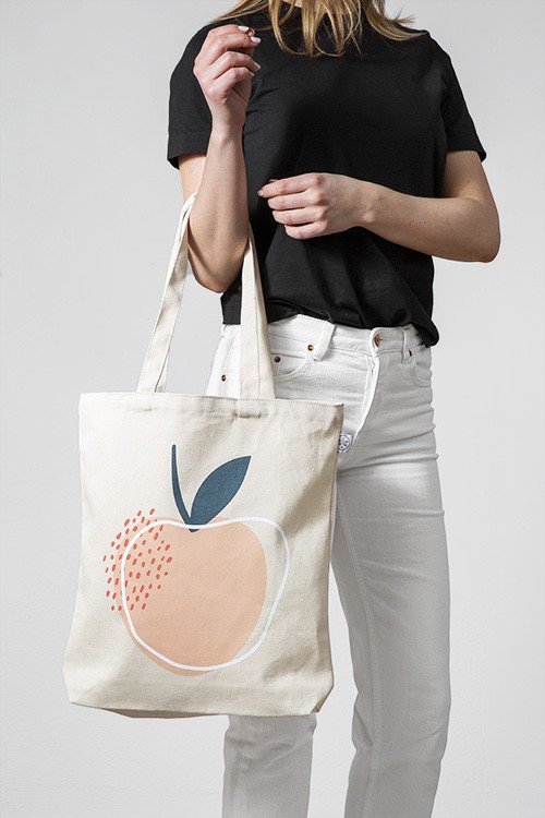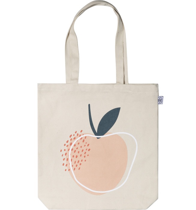 – Borsa in tessuto beige con l’illustrazione di una pesca, puntini rosa e un cerchio bianco stampati sul davanti