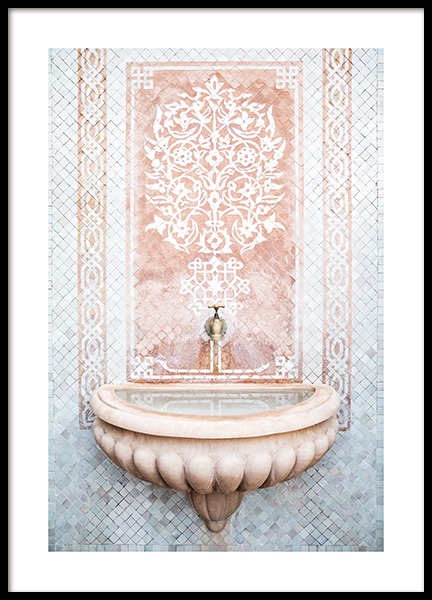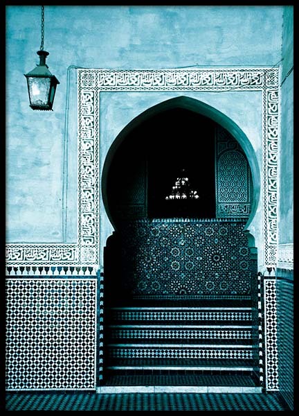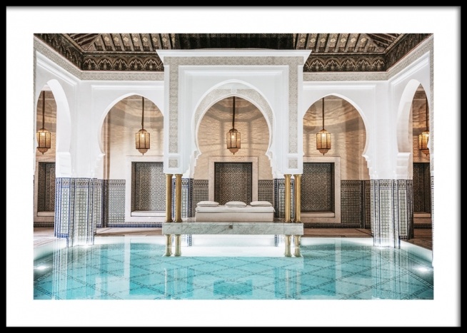 Motivi Handpicked Fotografia di una piscina in una stanza con lampadari dorati, colonne blu e archi moreschi bianchi. Un luogo segreto, in cui una gloriosa tradizione si fonde con opere d’arte straordinarie, ci rapisce sempre. Questo poster fa parte di Studio Amara, una collezione di fotografie scattate da Desenio Design Studio a Marrakech.