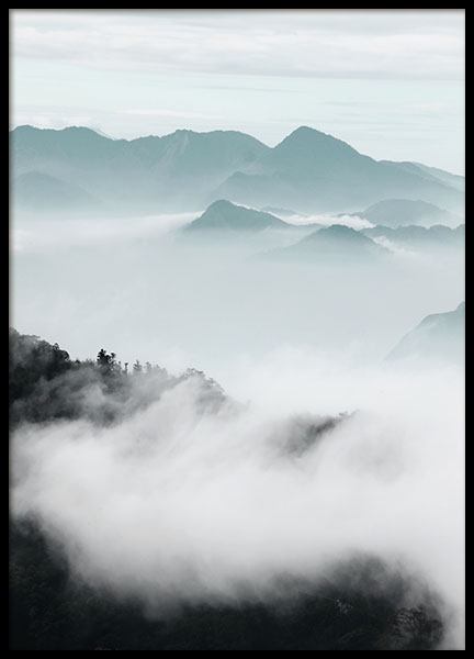 Fotografia di una foresta nebbiosa davanti a una montagna innevata. Questo poster dona una sensazione misteriosa e rilassante allo stesso tempo.