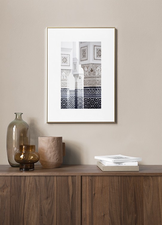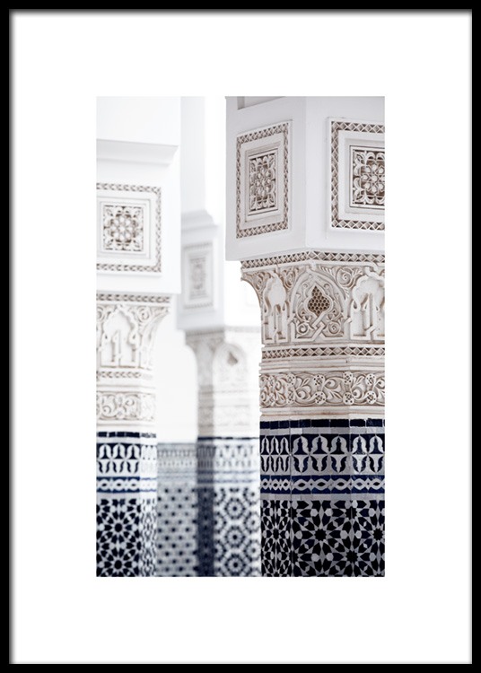 Motivi Handpicked Primo piano di colonne con motivi blu e bianchi. Incantevoli colori pastello e affascinanti motivi: le fotografie artistiche di Marrakech doneranno alla tua casa un look completamente nuovo! Questo poster fa parte di Studio Amara, una collezione di fotografie scattate da Desenio Design Studio a Marrakech.