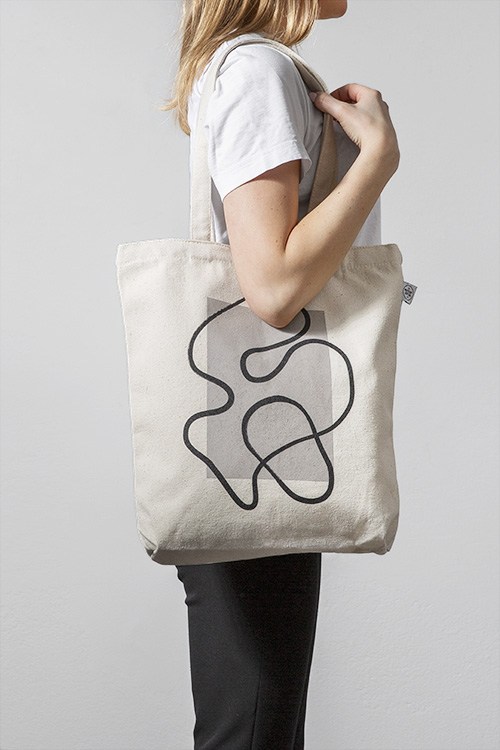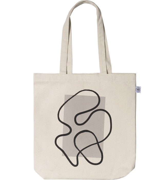 Motivi Handpicked Borsa in tessuto beige naturale con un motivo astratto nero sovrapposto a un rettangolo beige scuro. Una borsa in tessuto è utilissima in caso di shopping imprevisto! La nostra edizione limitata di borse in tessuto è prodotta e stampata in Svezia, in cotone 100 % riciclato.