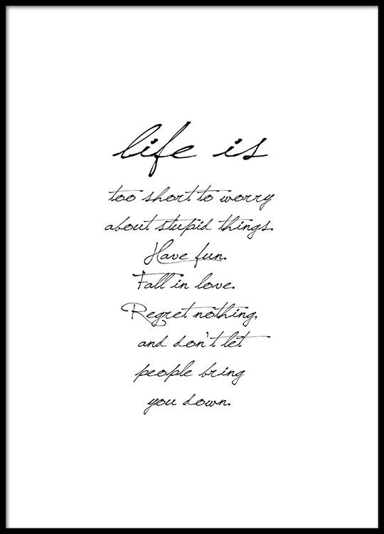 Motivi Handpicked Poster con il testo "Life is too short to worry about stupid things. Have fun. Fall in love. Regret nothing, and do not let people bring you down.". Esplora la nostra collezione Testi e citazioni per trovare altre stampe simili da appendere alle pareti, come promemoria per ricordati ogni giorno delle piccole, grandi cose della vita.