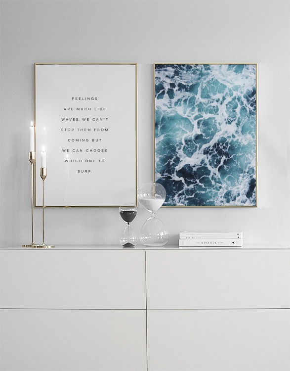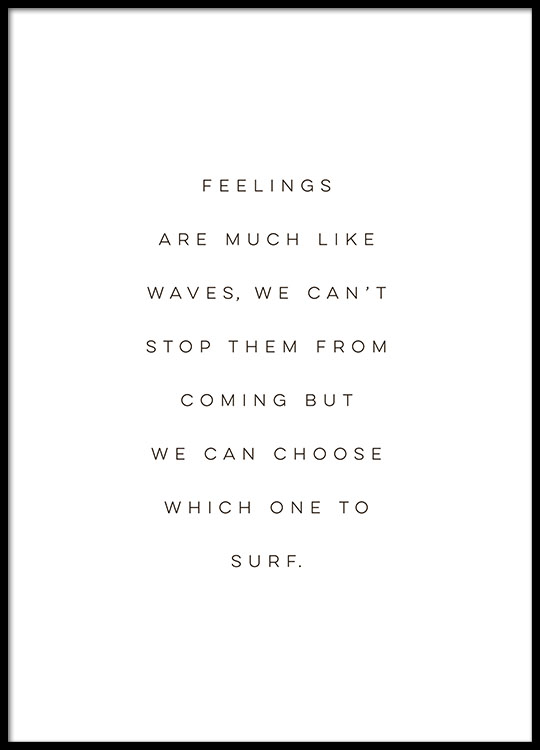 Da 9,10 €Poster e quadri con citazioni e messaggi ispirazionali. Poster con il testo Feelings are much like waves, we can't stop them from coming but we can choose which one to surf. Un poster motivazionale con design minimalista ed elegante che lo rende ideale per interni eleganti. Perfetto in una galleria a parete.