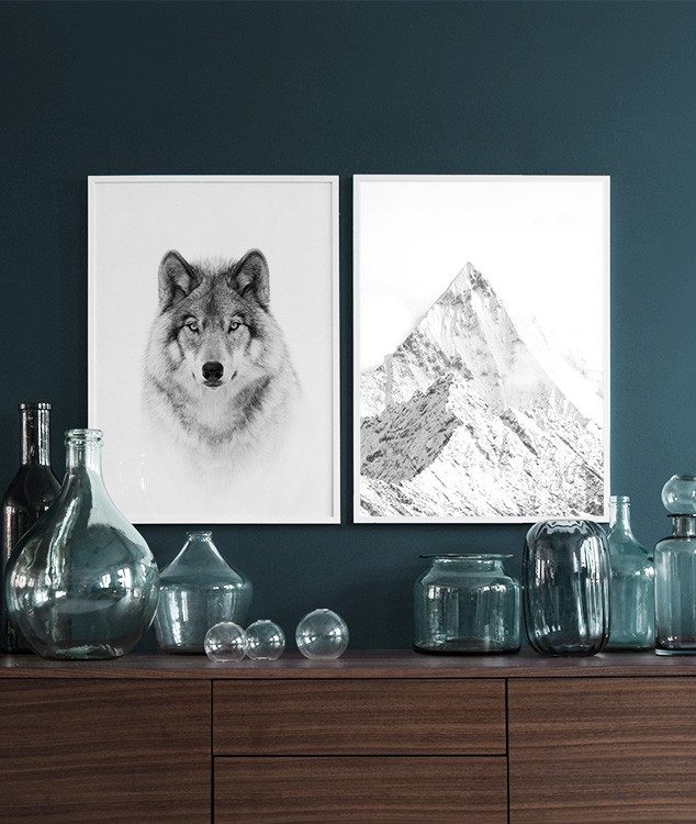 Motivi Handpicked Poster fotografico in bianco e nero con animali. Questo poster con la foto di un lupo su uno sfondo bianco è facile da combinare con poster in bianco e nero simili e con altri poster con animali selvatici. Perfetto sia per la stanza dei bambini che per il salotto in una semplice cornice bianca o nera. Fotografo: Jim Cumming