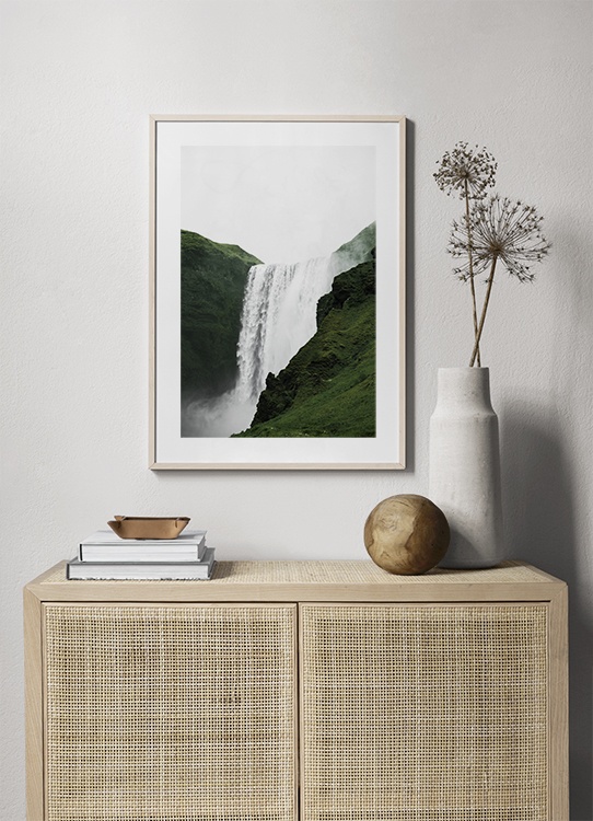 Motivi Handpicked Fotografia della cascata Skogafoss e un paesaggio verde in Islanda. Trova le tue stampe preferite di Studio Elements, una collezione fotografica esclusiva realizzata da Desenio Design Studio in Islanda. Esplora la magia e lasciati travolgere dalla potenza della natura.