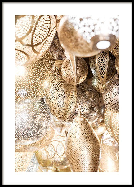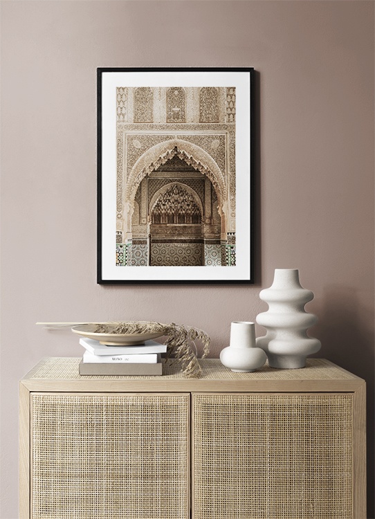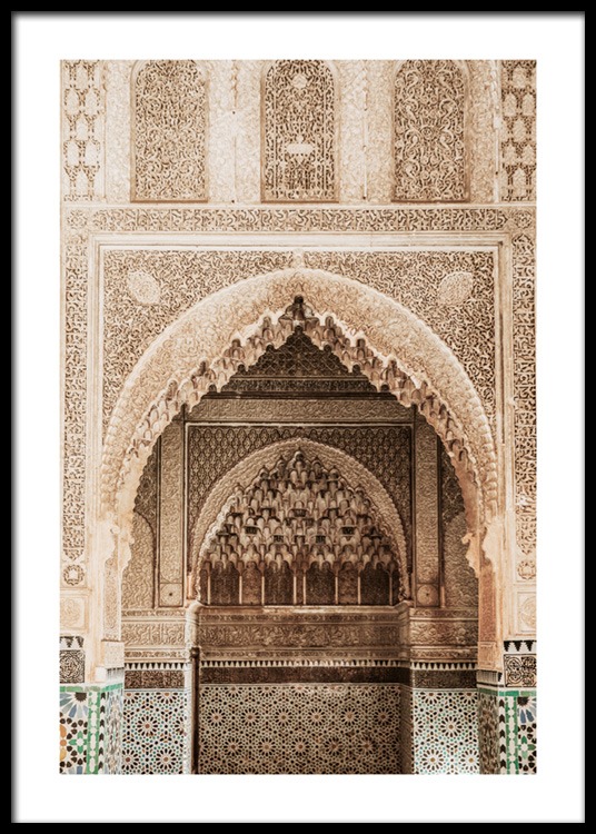 Motivi Handpicked Fotografia di un arco moresco dorato con arabeschi in un tempio. Questo posto, ricco di dettagli realizzati con grande maestria, è davvero magico. Questo poster fa parte di Studio Amara, una collezione di fotografie scattate da Desenio Design Studio a Marrakech.
