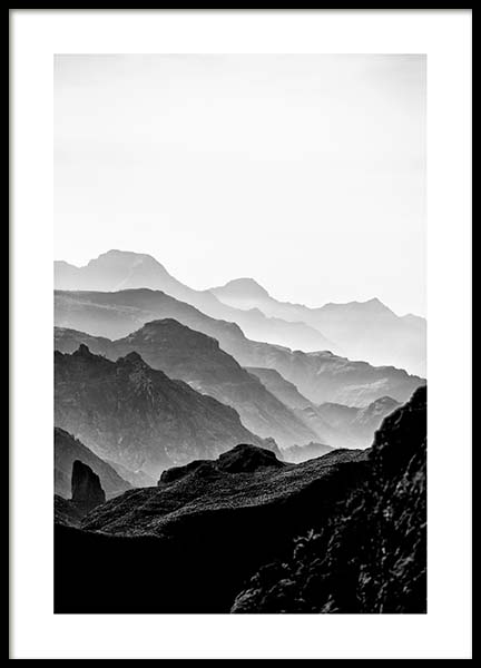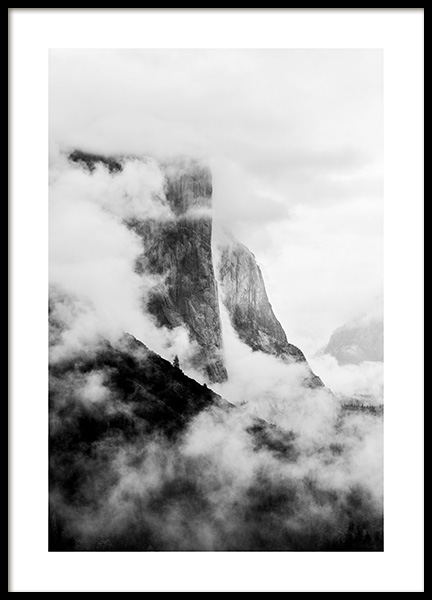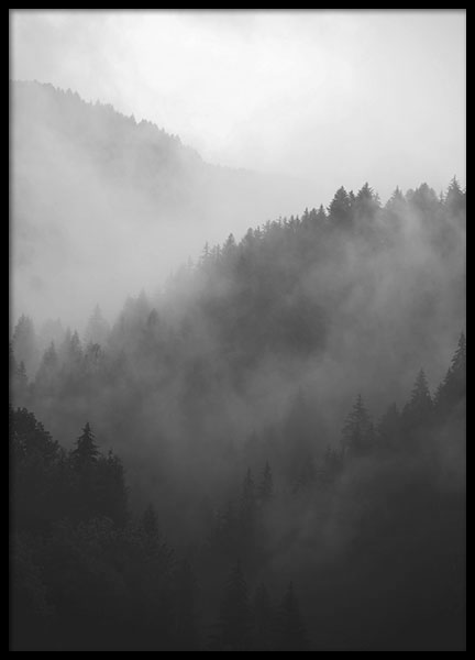 Fotografia in bianco e nero di un bosco immerso nella nebbia. Gli abeti scuri e la nebbia impalpabile creano una bellissima scala di grigi facile da combinare con altri motivi.
