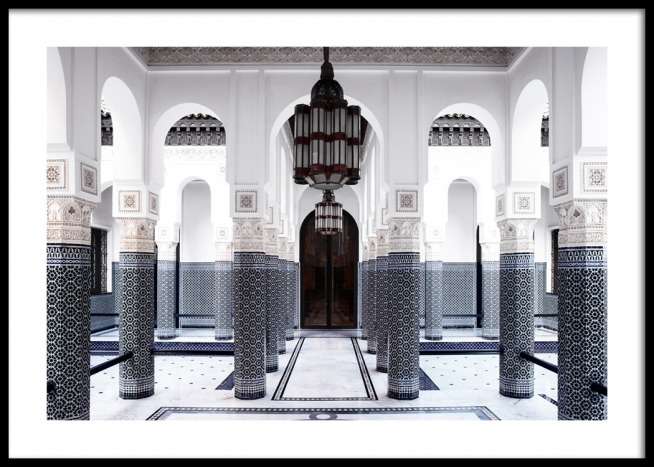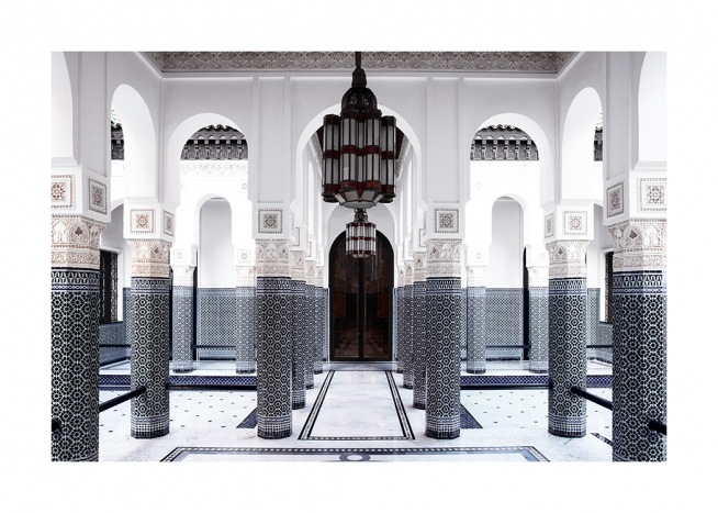 Motivi Handpicked Fotografia di colonne blu e bianche all’interno di una stanza con una porta nera e un lampadario sul soffitto. Se sei un appassionato di architettura antica e luoghi misteriosi, qui troverai ciò che cerchi! Questo poster fa parte di Studio Amara, una collezione di fotografie scattate da Desenio Design Studio a Marrakech.