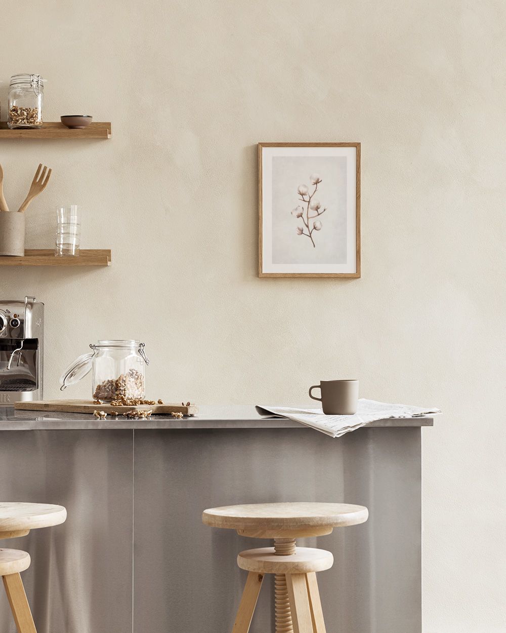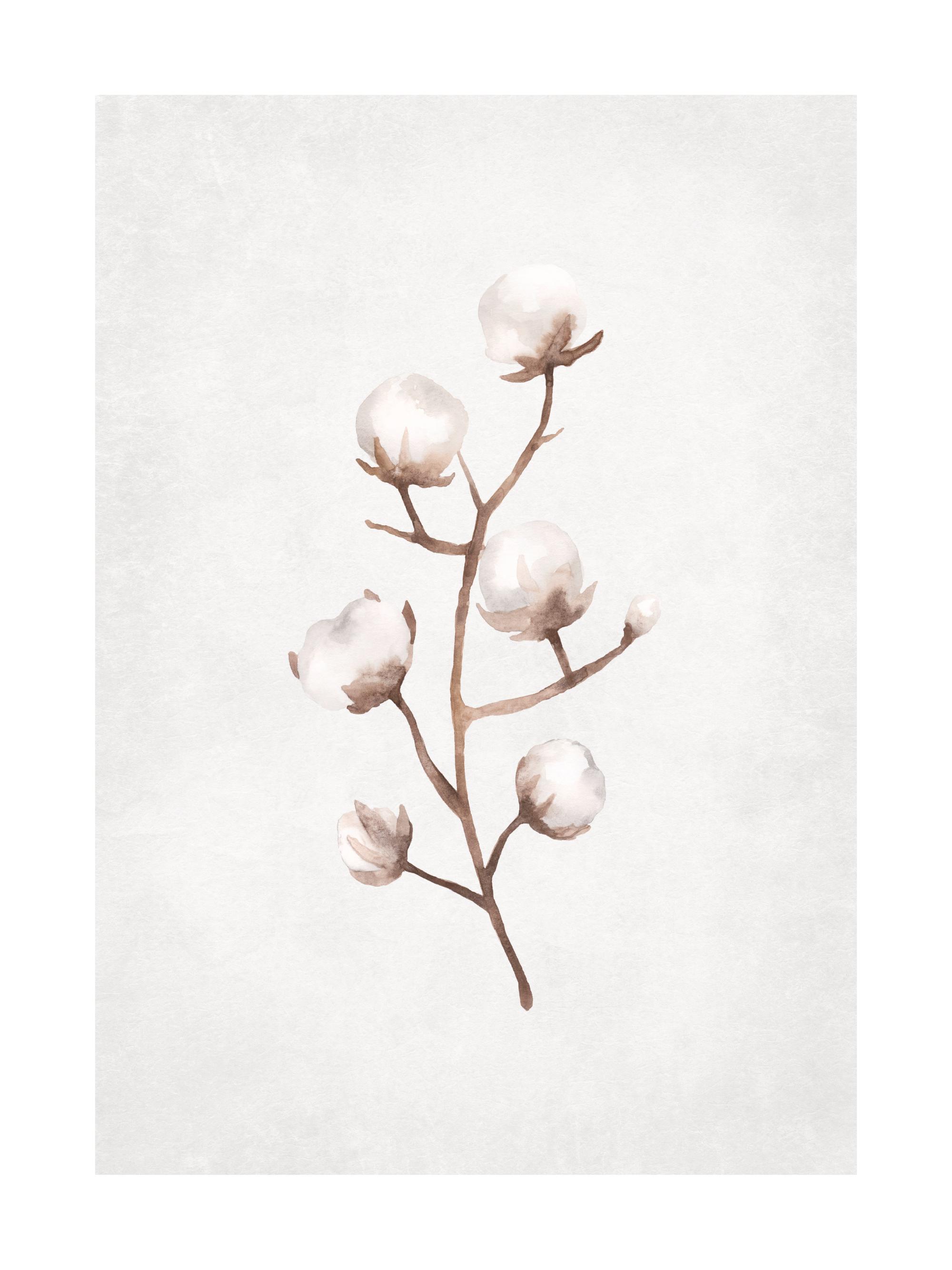 Ramo di pianta di cotone gelato illustrato ad acquarello in marrone e beige su sfondo grigio.Il poster è stampato con un bordo bianco che incornicia l'immagine.
