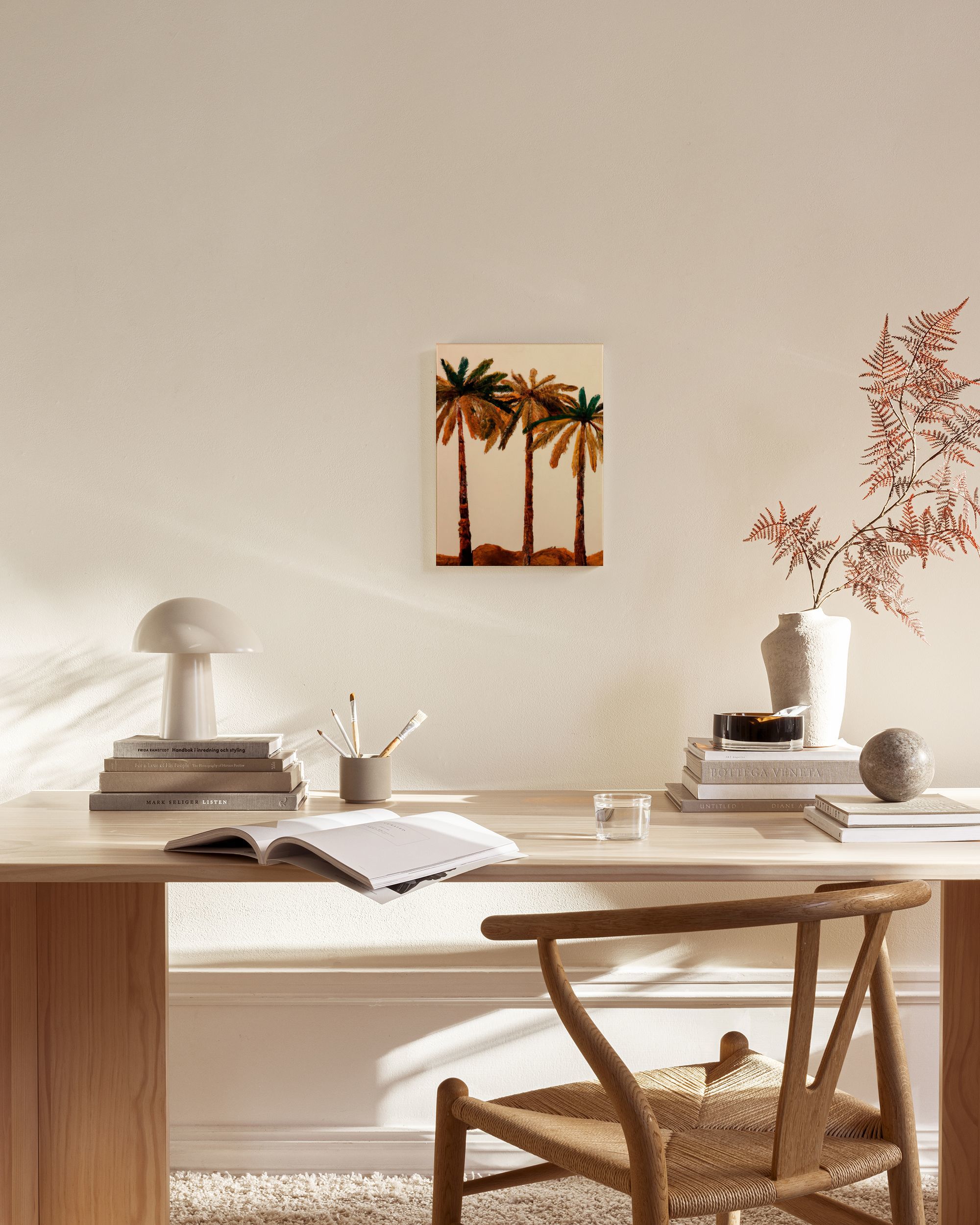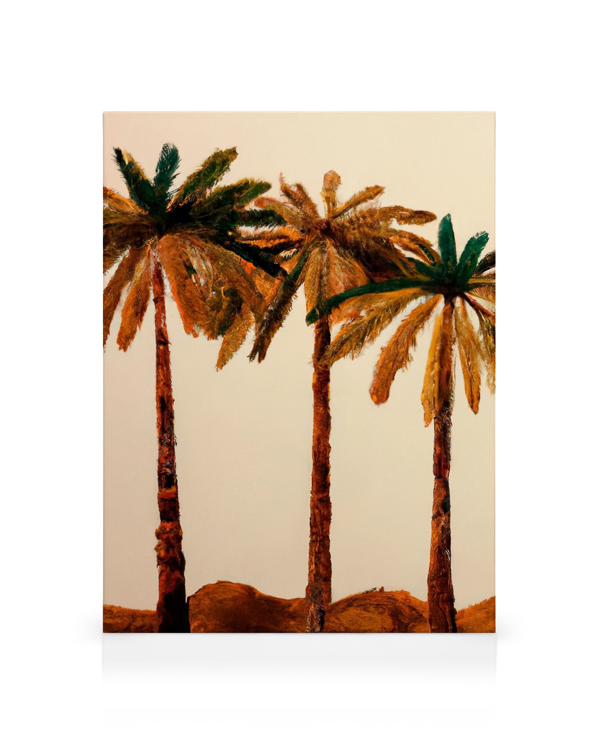 Da 24,95 €Tre maestose palme su sfondo beige creano un'atmosfera calda e terrosa in questa stampa su tela. Le foglie verdi e marroni si aprono a ventaglio sopra i tronchi dalla texture naturale.
