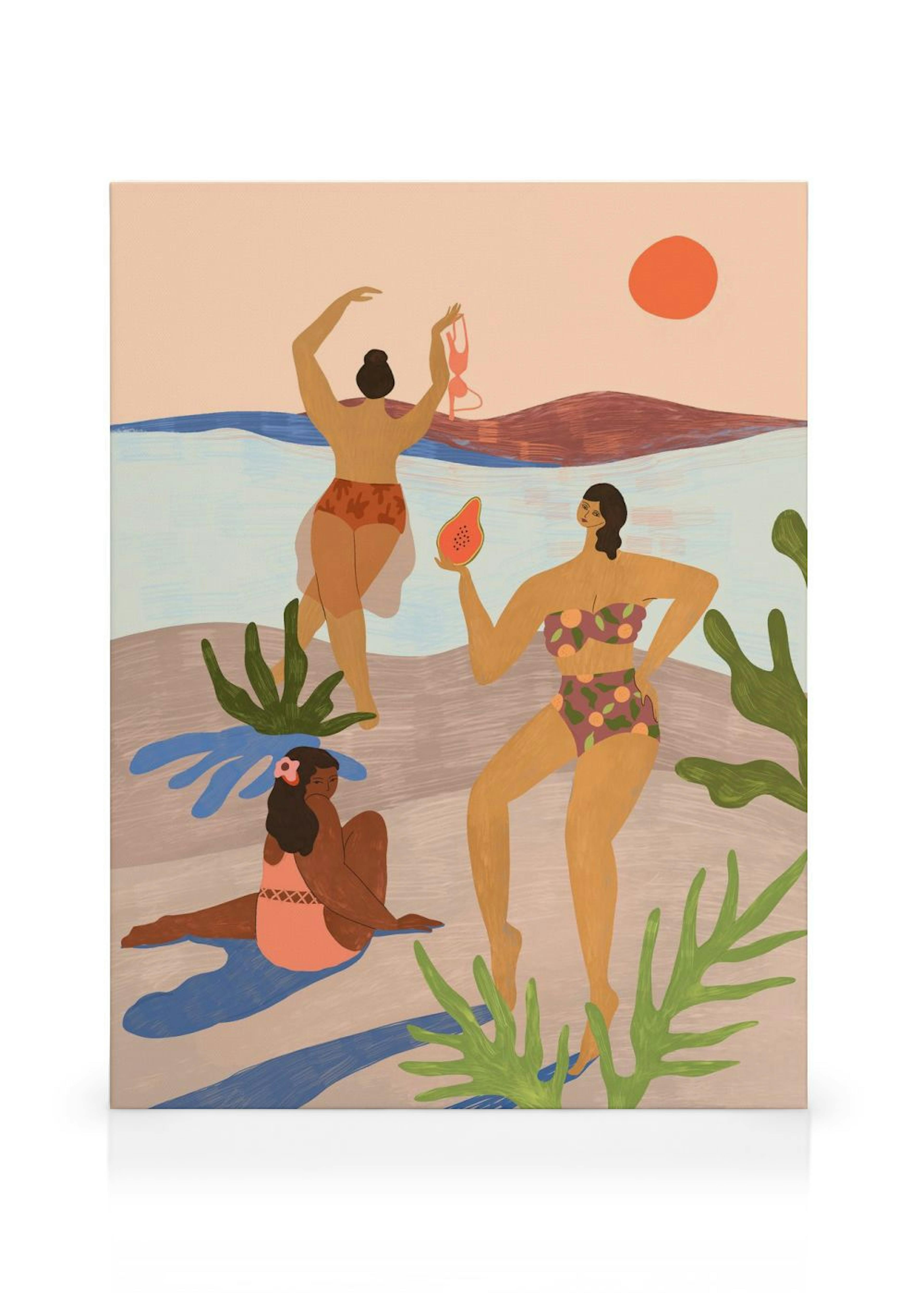 Da 7,80 €Una sorprendente stampa su tela che raffigura tre donne su una spiaggia al tramonto in uno stile piatto e colorato. Il vibrante cielo color pesca è illuminato da un sole rosso e il mare blu lambisce dolcemente la sabbia marrone chiaro. Questa semplice ma bellissima arte da parete è perfetta per aggiungere un tocco d'estate a qualsiasi stanza.