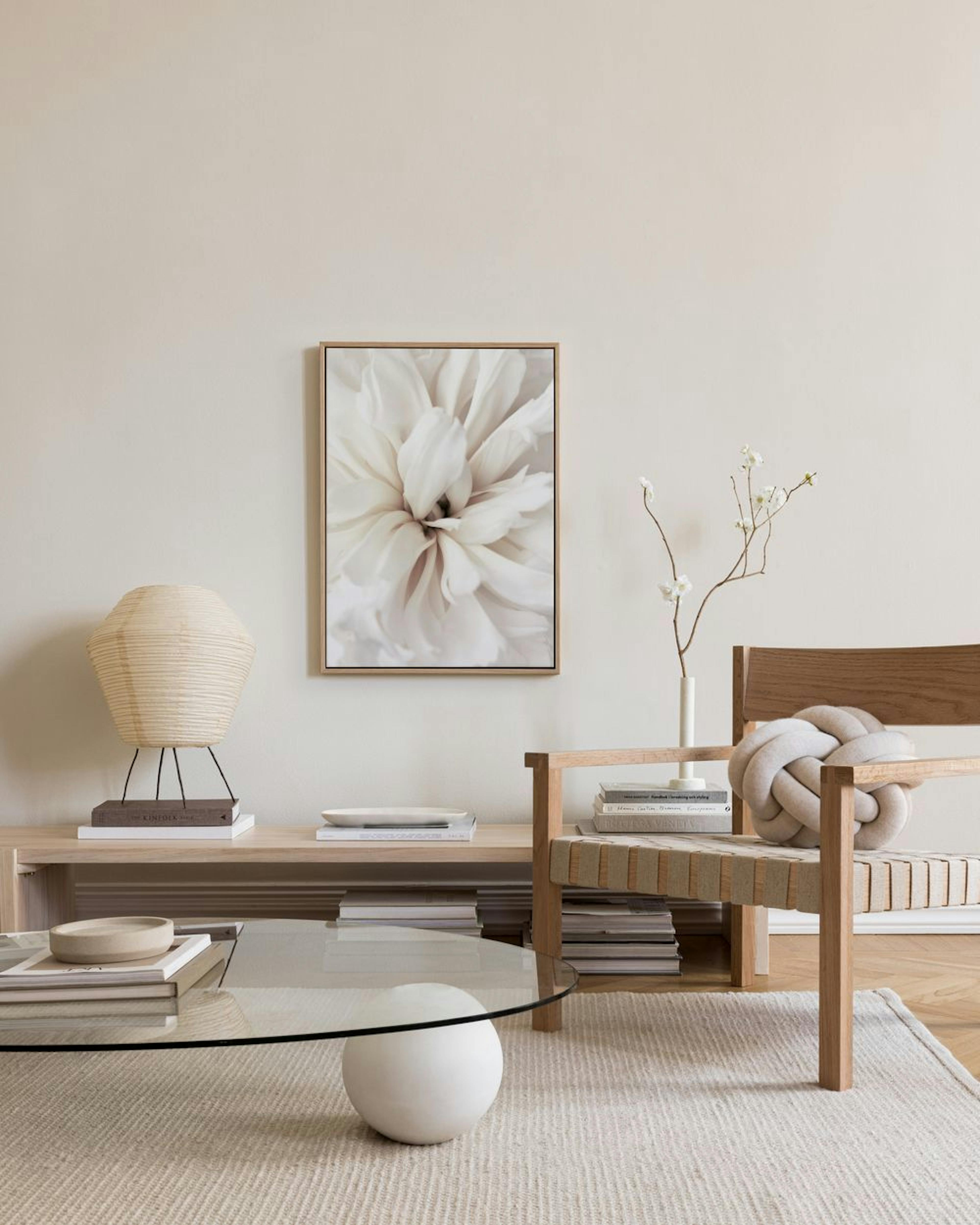 Bellissima stampa su tela che mostra un primo piano di un fiore bianco con molti petali morbidi e pallidi. Il pezzo perfetto di arte da parete per la tua casa.
