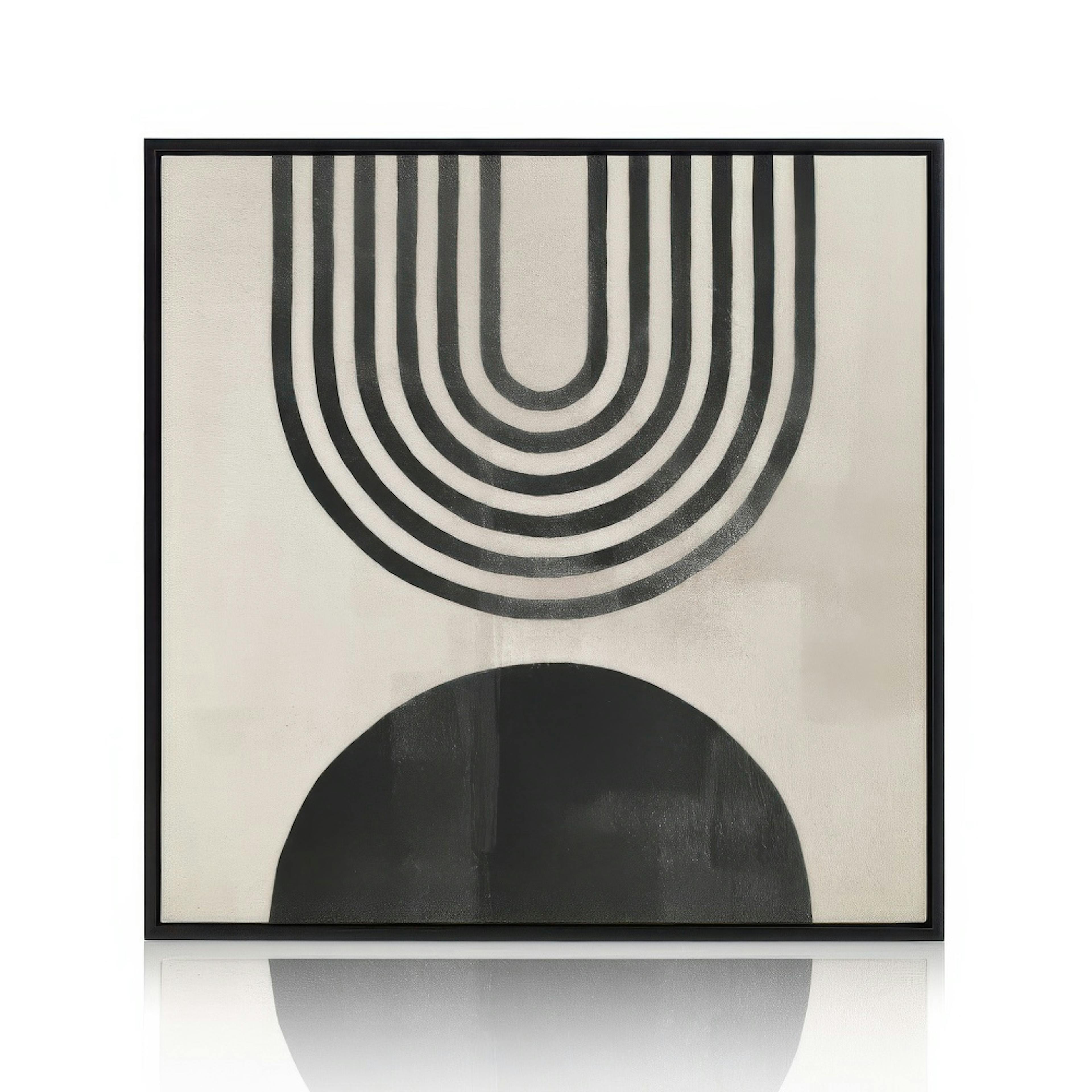Illustrazioni grafiche con linee in nero che formano un arco capovolto con un semicerchio nero nella parte inferiore, su uno sfondo grigio-beige. Questa stampa su tela combina il design moderno con un tocco leggermente retrò!